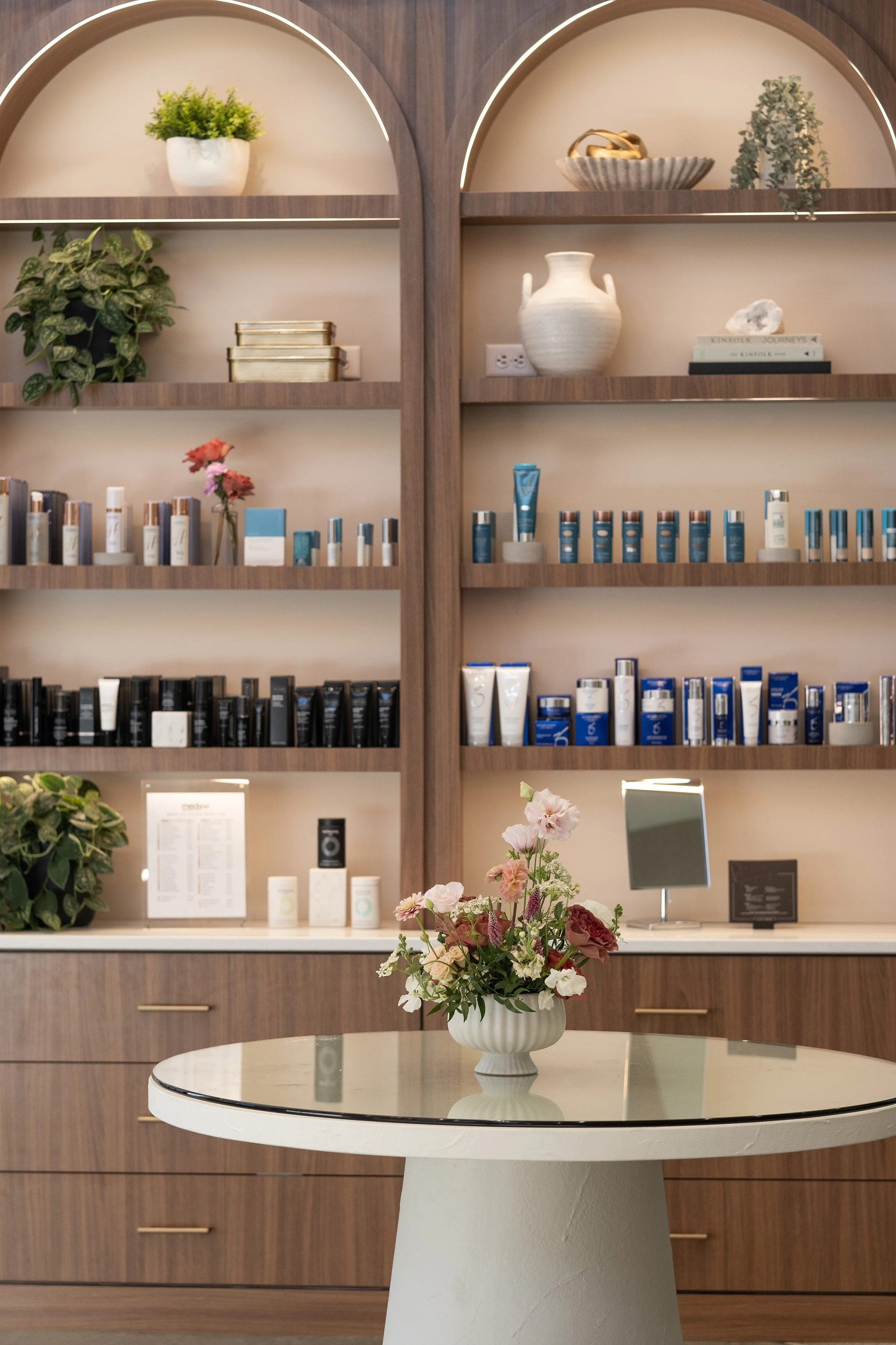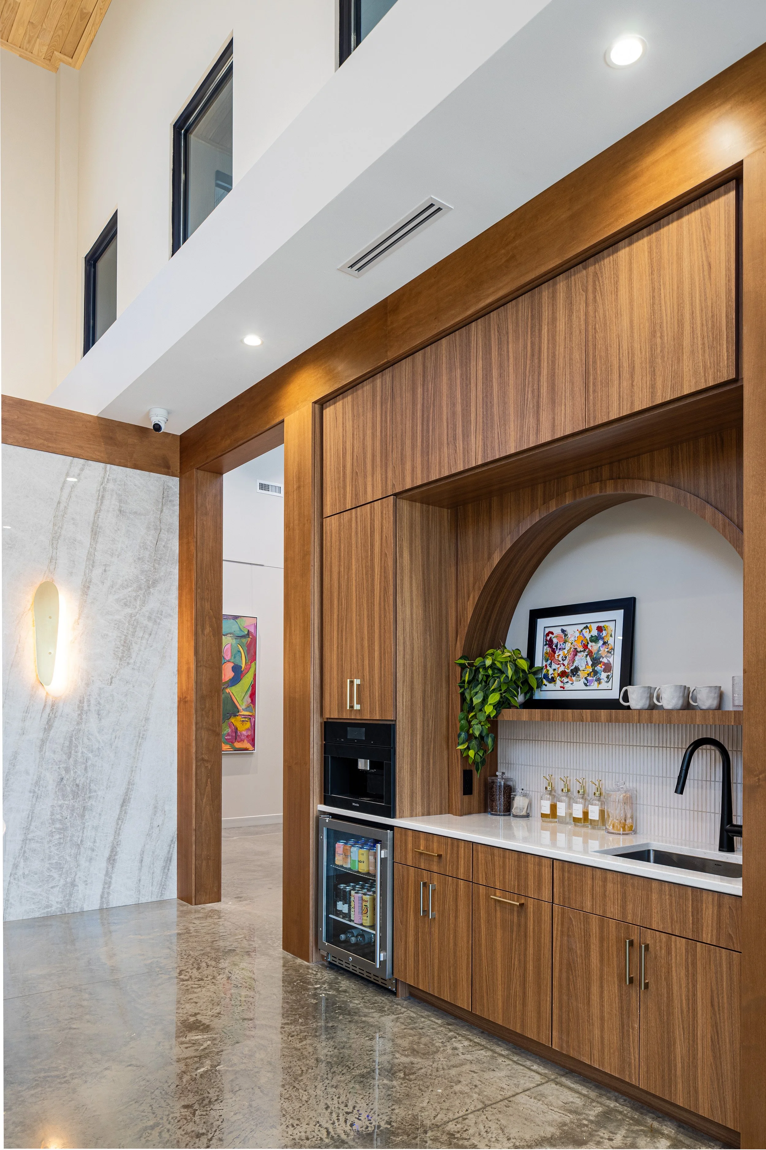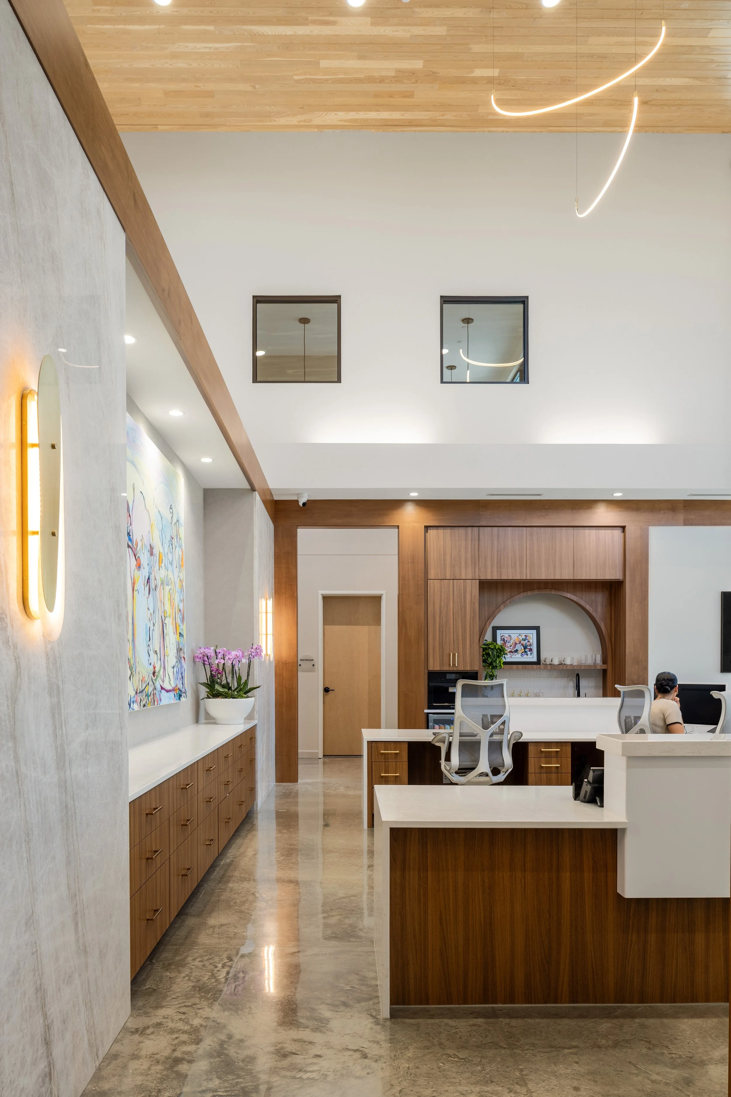 Brandi's guidance and experience helped balance the design's masculine and feminine qualities, understanding the space and clientele. The spaces are intentional for the team and there is an abundance of natural light. The brightness creates a beautiful energy for both team and patient. CFPS used signature design elements such as repeated arches, built-in casework, inset lighting, and darker-stained wood shelving. Stone wall-coverings, warmer stains, black accents and a variety of textures in upholstery were also chosen.