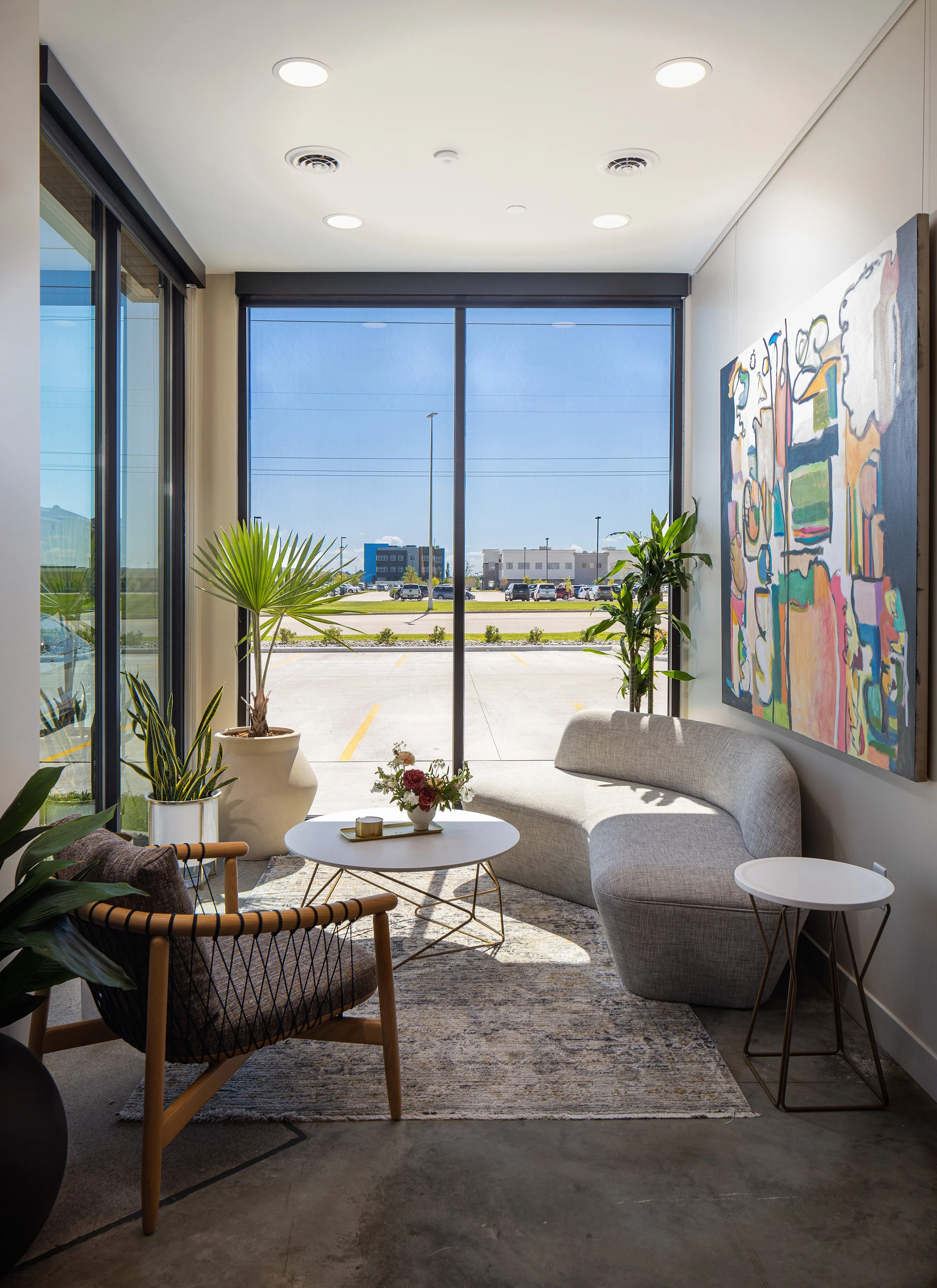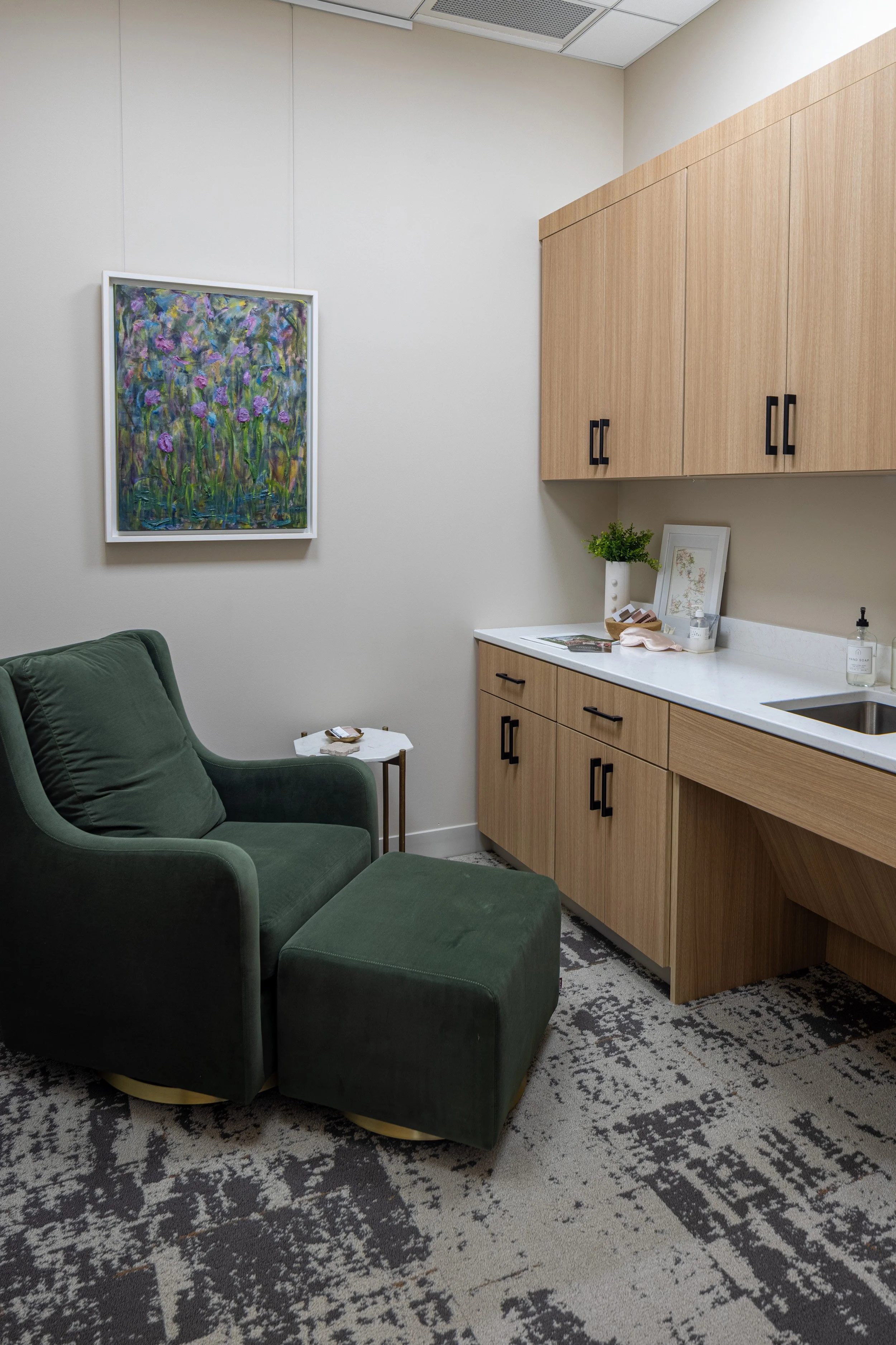 Dr. Nicholas and Alissa Adams recruited Brandi to help refine the space, tailor its function and select finishes for the Center for Plastic Surgery. Brandi achieved Alissa's vision for a more organic, warm, and cozy space, with incorporating a lot of natural materials, and different textures. This was no typical stark white, institutional setting, but a welcoming and warm environment.